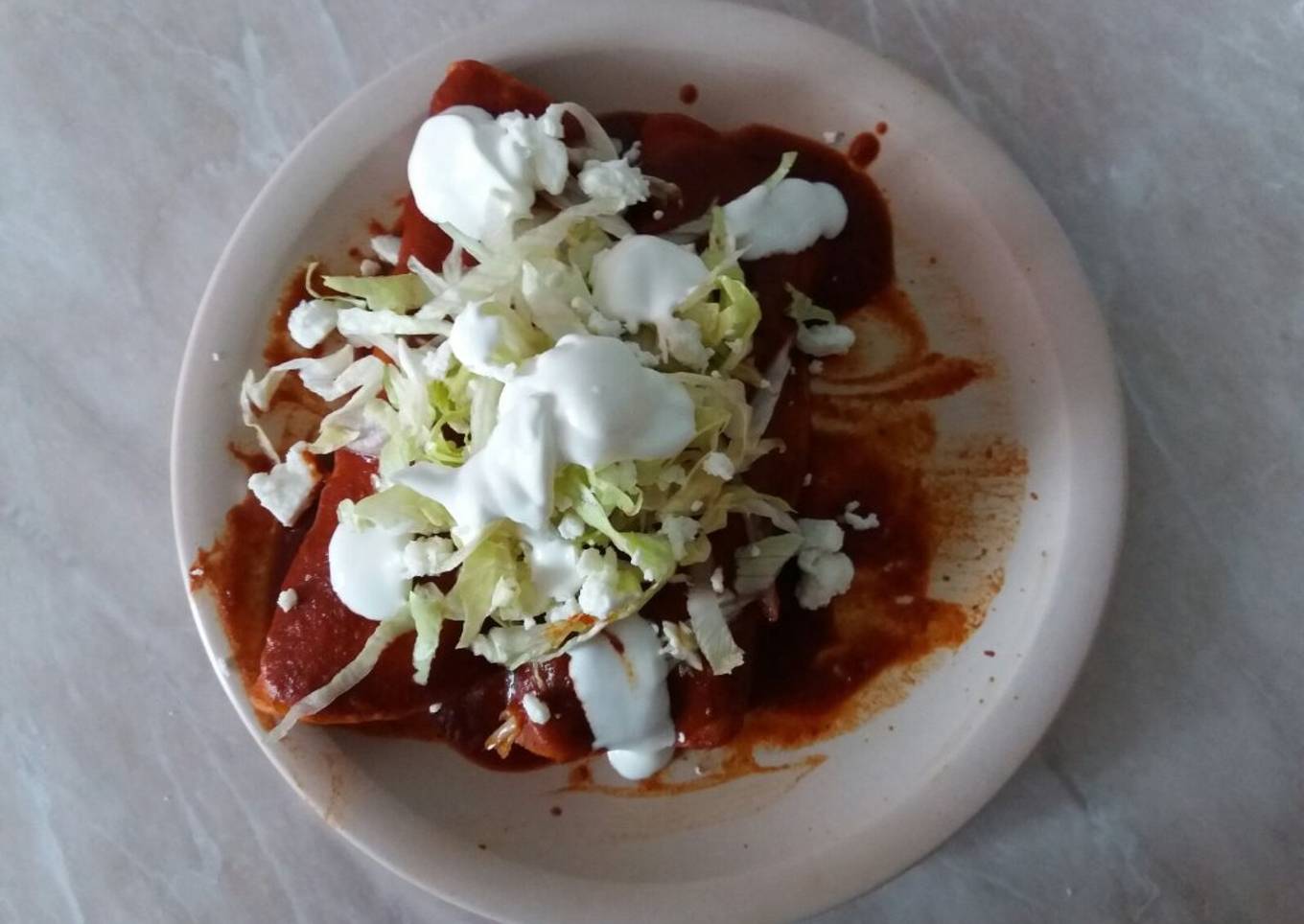 - Se calientan en aceite o manteca las tortillas, se pasan por la salsa, se les pone el relleno y se adornan con la lechuga, queso y crema.