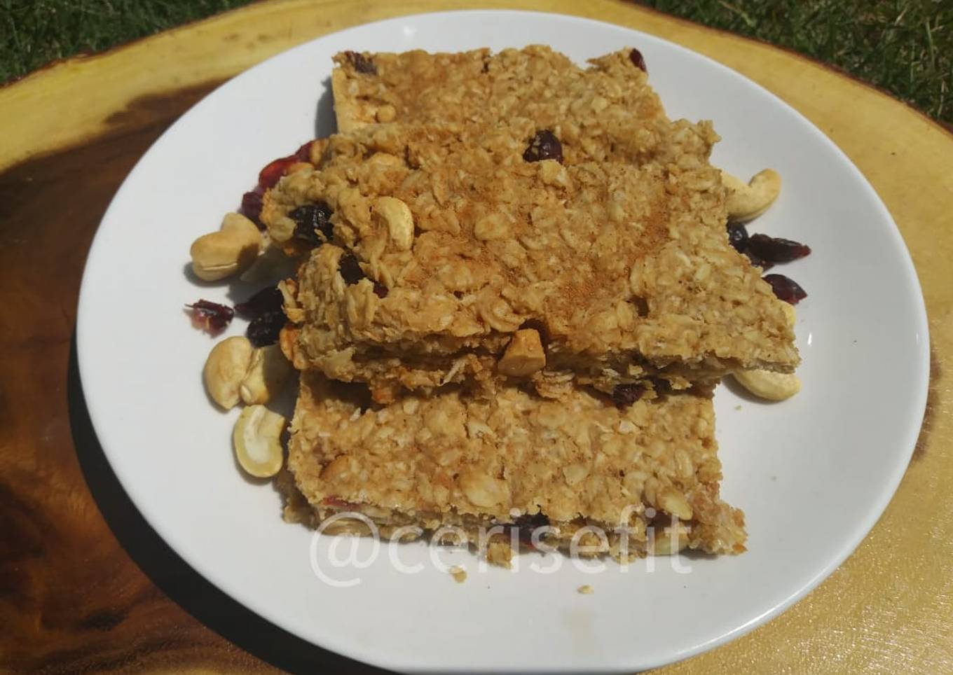 Retirar el cashew del horno, agregar la avena, el coco rallado, los frutos secos y arándanos a la mezcla de mantequilla de maní. Luego en una bandeja de metal cubierta de papel encerado colocar la mezcla y hacer un cuadrado. Hornear por unos 20 minutos. Luego dejar reposar antes de cortar.
