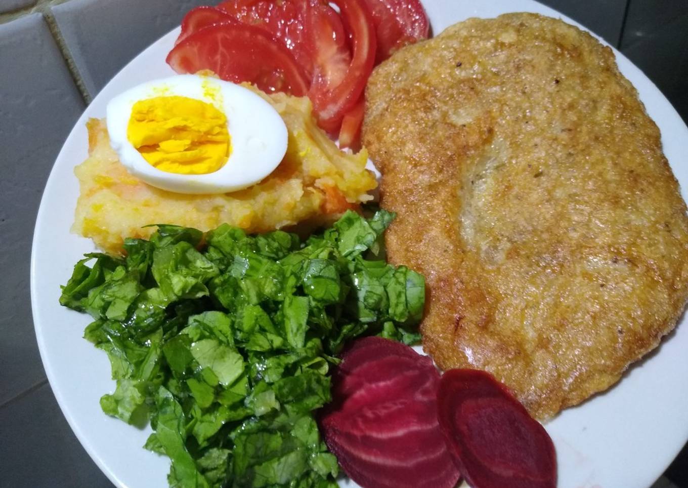 - Mientras se fríen, corté tomate y 2 hojas de lechuga y dispuse en el plato. Coloqué puré, luego huevo duro y rodajas de remolacha. Luego la milanesa. Pueden adornar con más condimentos. Yo lo prefiero así, más sano.