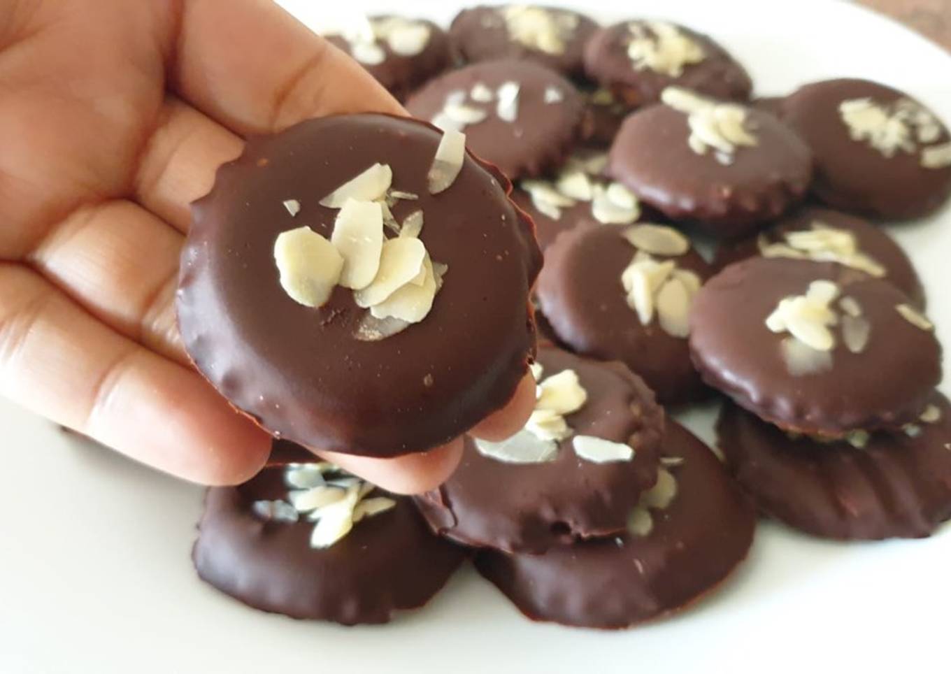 - Mojamos las galletas en chocolate que hemos derritedo en el microondas luego la decoramos con almendras laminadas positivos de chocolate lo que tenéis en vuestra cocina que aproveche