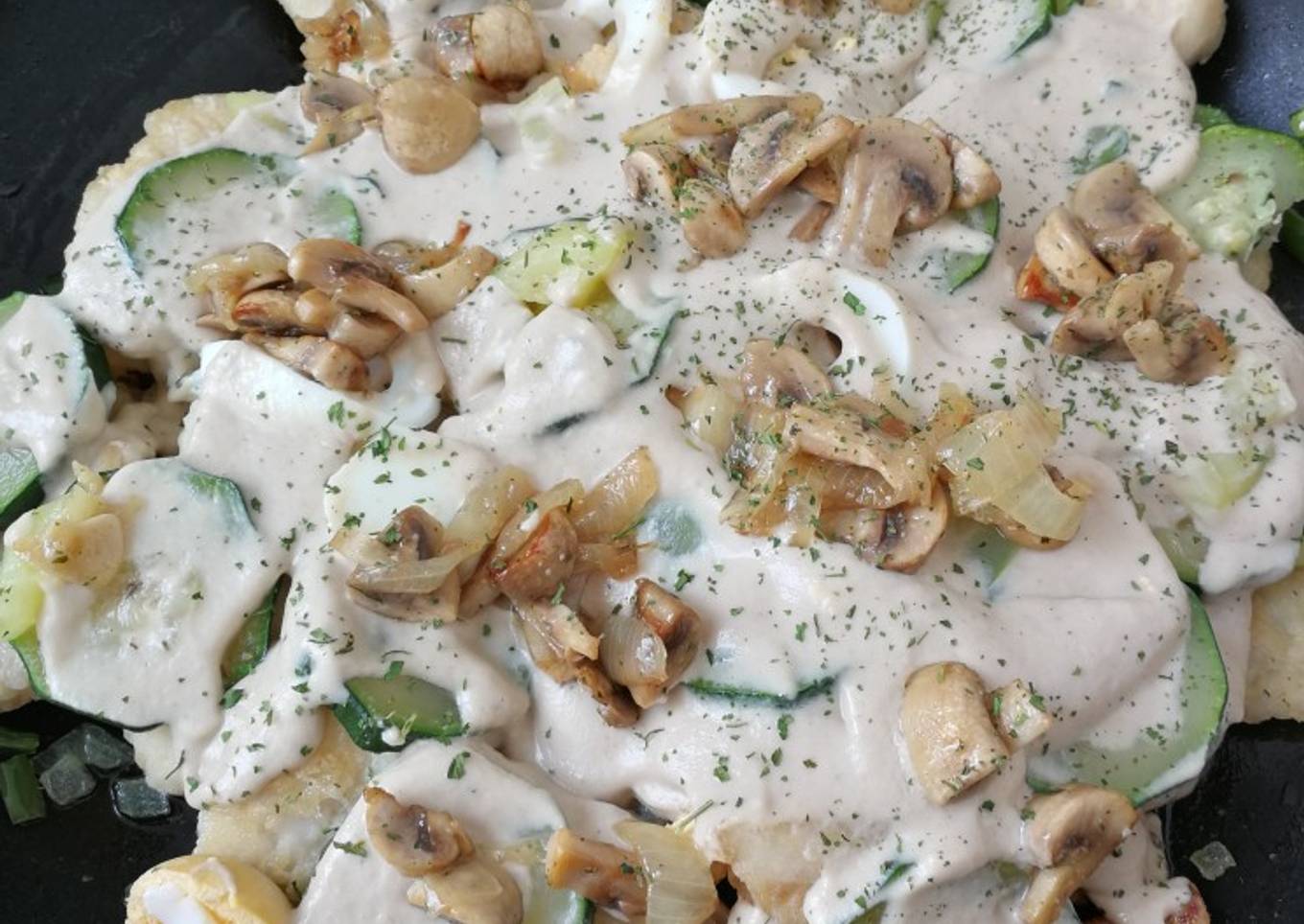 En la cacerola ponemos la merluza y las gambas por encima la salsa y los chips de calabacín y alrededor el huevo. Por último decoramos con perejil el resto del plató.
