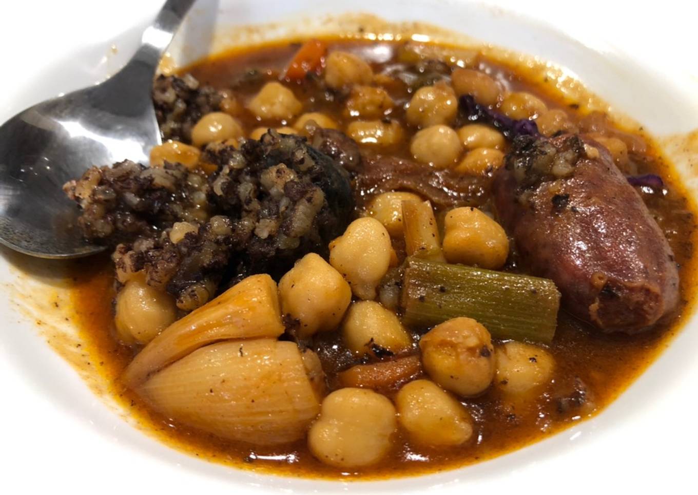 Un guiso calentito de garbanzos, ajos tiernos, pimiento y un toque de morcilla y chorizo.