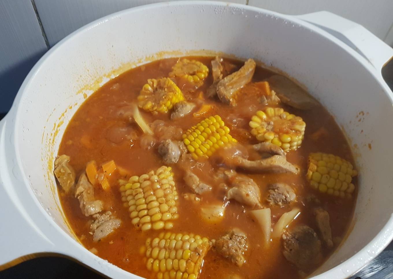 Bueno no tenía muchas cosas en la heladera(fin de mes como le decimos acá ja ja) creo que a todos nos pasa en algún momento del mes🤭, así que recurrí a mi amado y salvador freezer y encontré de todo. Por suerte, tenía: choclos que me había regalado mi papá, encontré una rueda de chorizo que sobró de un asado, bondiola unos cuántos churrascos y también tenía una suprema de pollo, con todo eso y algunas cositas salió este estofado bien completo y comimos varios días 😊. En casa son un éxito estas comidas de olla a mi Santi le gustan mucho y con arroz obviamente . El pobre frezzer quedó casi vacío pero a mí me solucionó un montón tener todo eso, lo recomiendo mucho para los que recién comienzan a cocinar es ideal tener guardado un poco de cada cosa para cuando no podemos ir a comprarla!