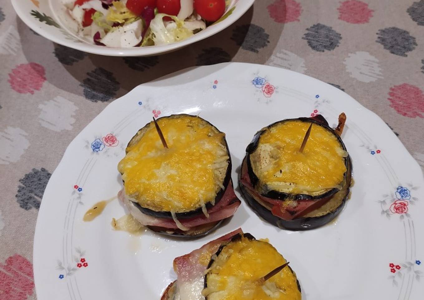 - En una fuente para horno preparamos una lámina de berenjena, encima una loncha de queso de cabra, encima una loncha de jamón York y terminamos con una rodaja de berenjena. Le ponemos un palillo para que aguante mejor su peso
