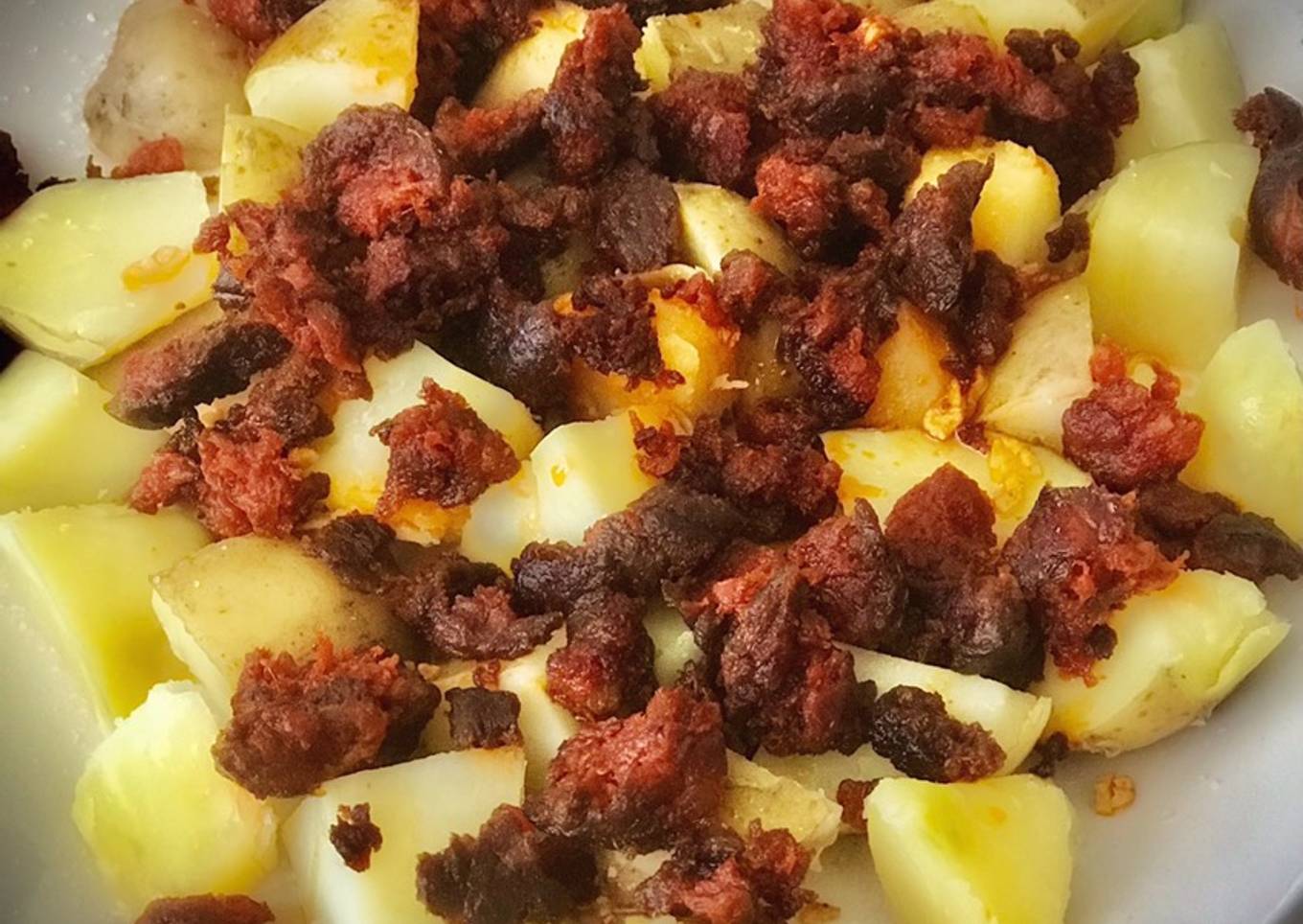 - Colocamos las patatas en una bandeja, incluimos el aceite con los ajos que teníamos reservados, y removemos para mezclar todo de manera homogénea. Y ponemos por encima “el sacramento”: el chorizo.