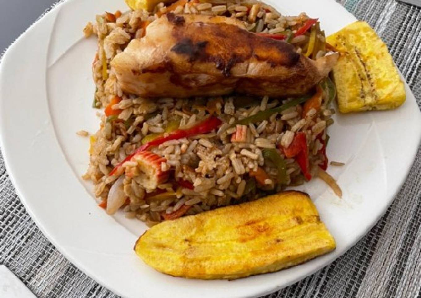 Arroz tierra y mar, con robalo en salsa teriyaki