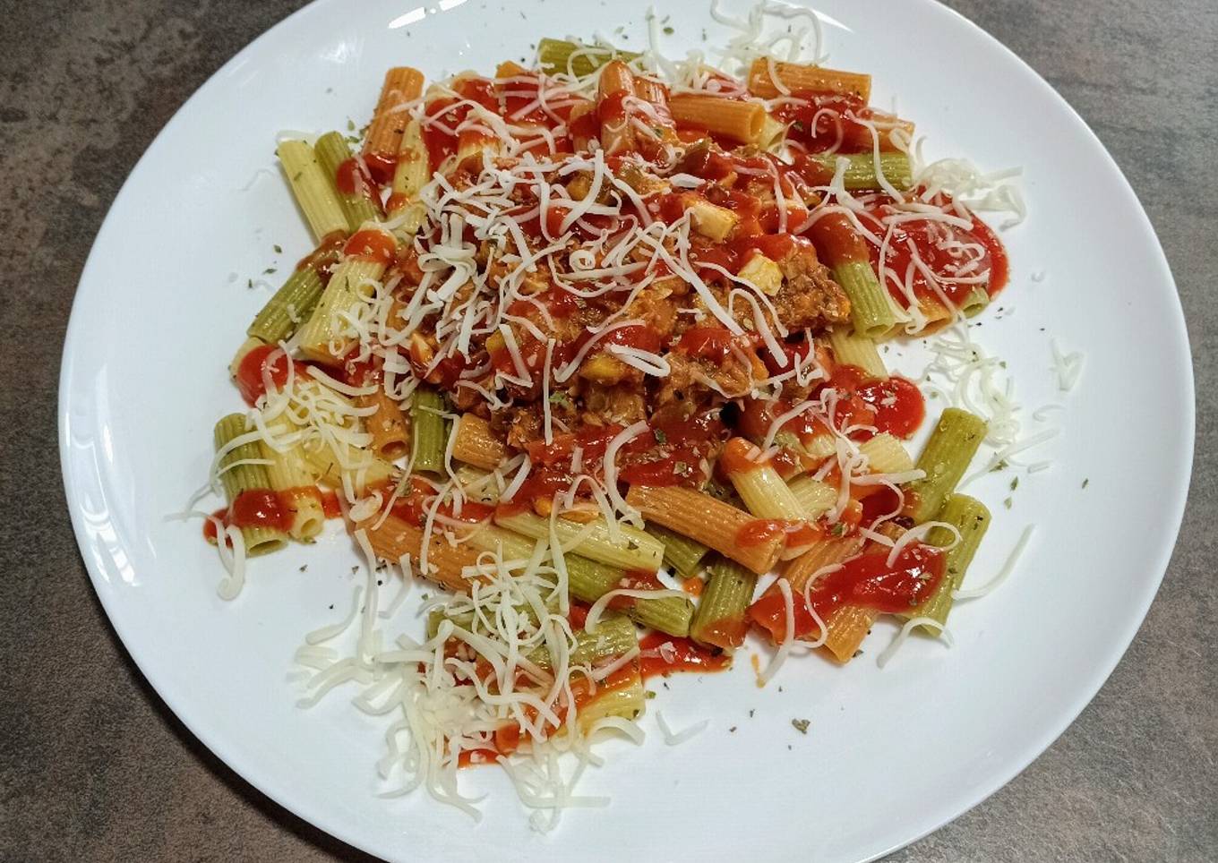 Macarrones rallados con verduras, huevo y atún