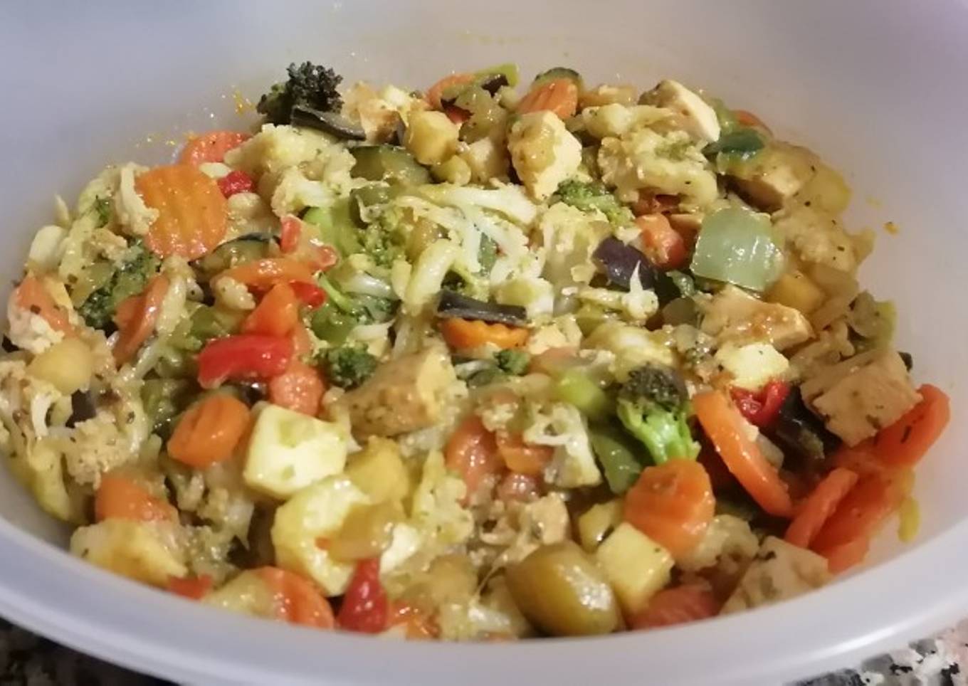 - En el airfryer meto las verduras con la pechuga de pavo, el queso burgos y sazono con sal, pimienta, cominos, sazonador espagueti. Programo 10 minutos a 200ºC. Listo para servir.